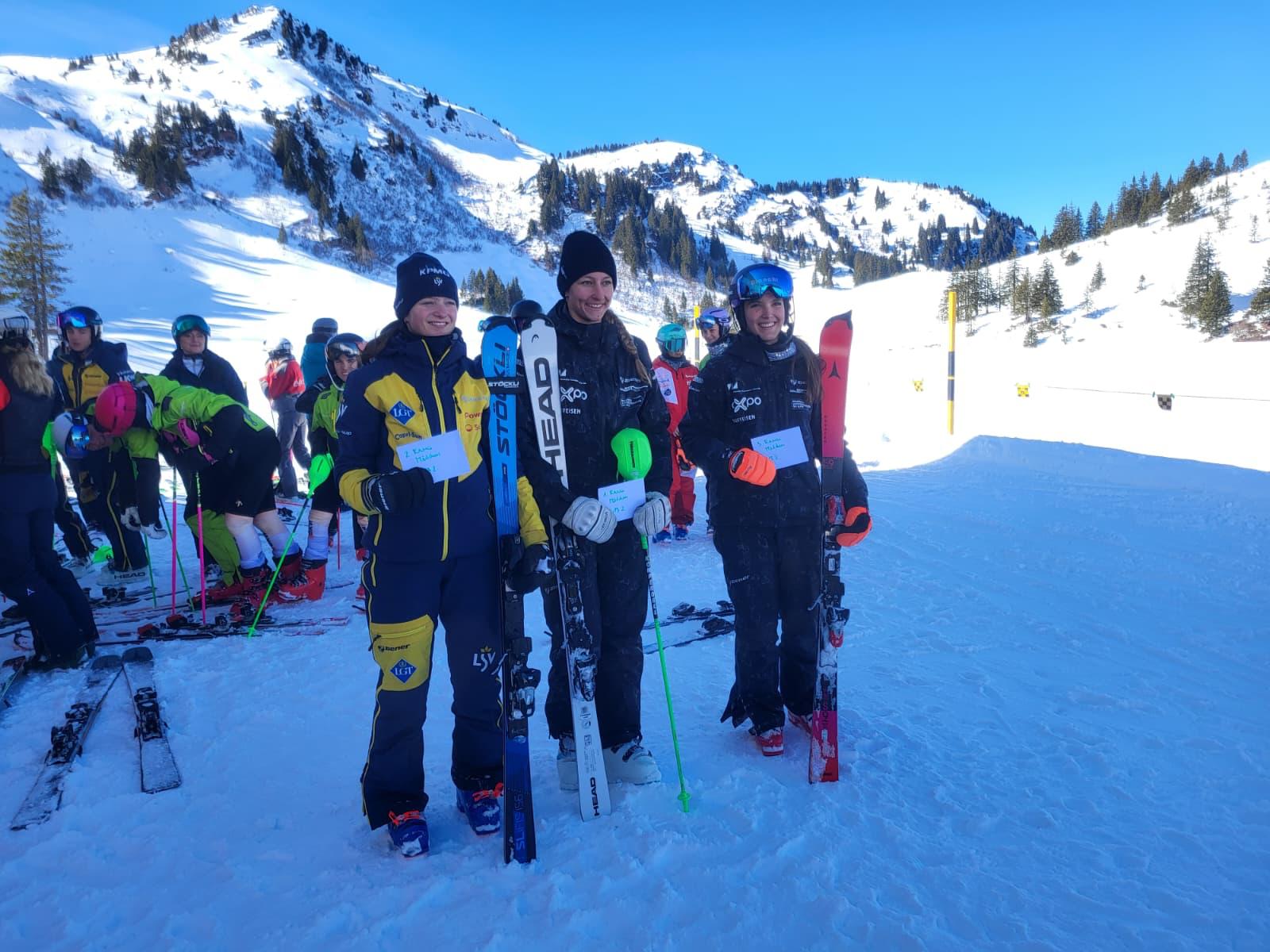 Am zweiten Renntag durfte Fiona Mirer (SC Obersaxen) jubeln: Mit zwei starken Läufen sicherte sie sich den Sieg und strahlte zusammen mit der Drittplatzieren Soé Bianchi (SC Obersaxen) mit der Sonne um die Wette. Charlotte Bayh bestätigte ihre starke Form mit Rang 4.